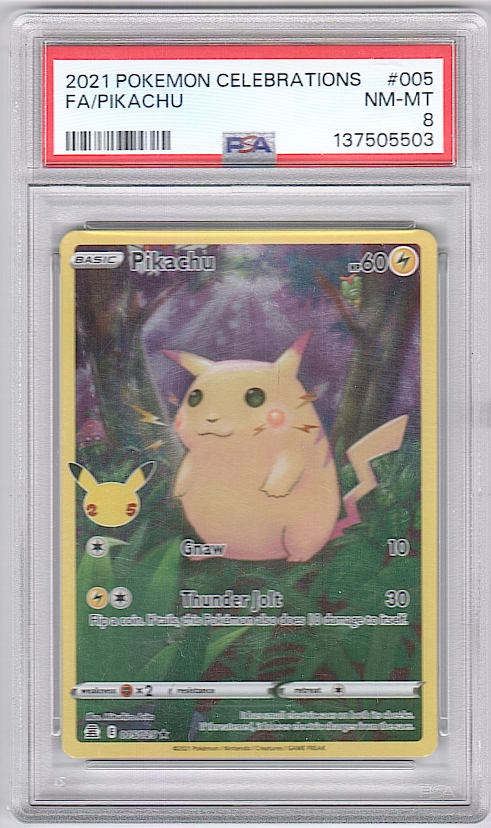 Pikachu (Celebrations 005/025) — professionally graded PSA 8.0 NM - MT. Encapsulated and authenticated. Holo Rare card. Premium addition to any graded collection.